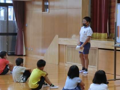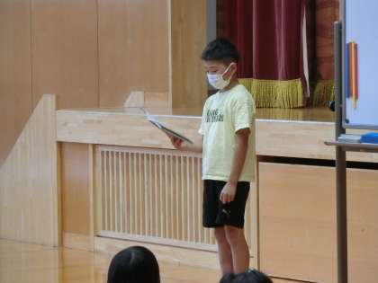 定期的に行っているお話集会ですが、今日は休み前の集会に合わせて全校の前で6人の子が発表しました。好きなこと、好きな遊び、4月からがんばったこと、夏休みに楽しみにしていること、頑張りたいことなどを話してくれました。