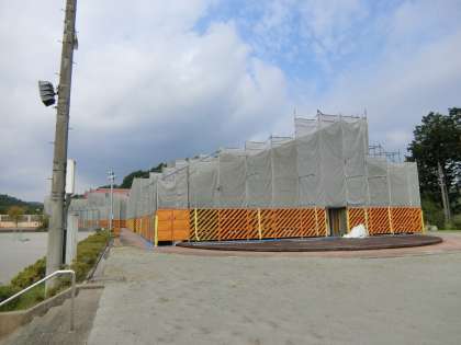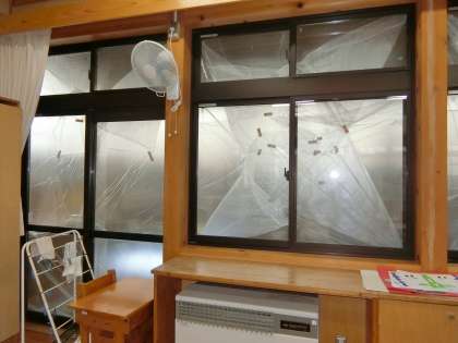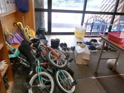 夏休み中も改修工事が進んでいます。夏休み前半に外壁の洗浄が終わり、塗り直し作業が行われています。今は教室の窓一面に保護シートが貼られ、窓を開けることができません。視覚的に息苦しさを感じます。また、子どもたちの出入り口は物置のような状態になっています。