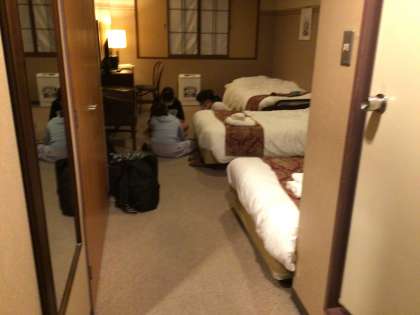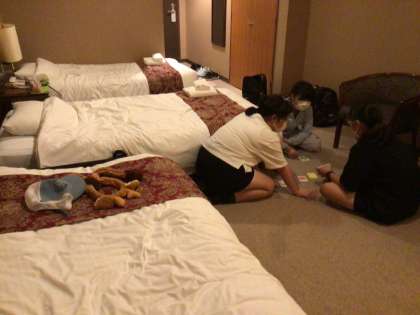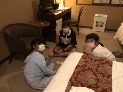 女子の部屋にも取材に行きました。扉の外まで笑い声が聞こえました。こちらも男子と同じようにカードゲームで盛り上がっていました。なぜか男子と同じく床で遊んでいました。とても楽しそうです。広めの部屋にベッドが3つ。空気清浄機もありました。このあとは入浴の時間です。