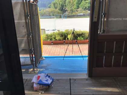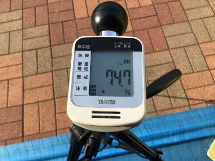 おはようございます。今週は晴天が続き、外での活動がしやすいです。が、まだ残暑は厳しく30度を超える日が続いています。もうしばらくは熱中症に注意が必要です。今朝も教頭先生が暑さ指数計を外に出してくれました。青空が広がっているようですが意外と湿度が高いです。空に飛行機雲のあとが残っています。