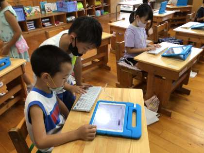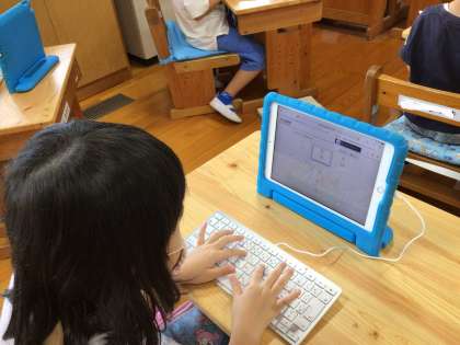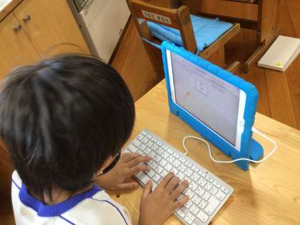 1年生教室をのぞきました。子どもたちはタッチタイピング(ブラインドタッチ)を練習していました。かわいい手がキーボードの上にかっこよく置かれていました。はじめに正しく身につけておくのはとても良いことですね。ちなみに我流でパソコンを使い始めた私は、後になって直そうとしても難しかったです。1年生の子たちが練習している姿を羨ましく感じました。