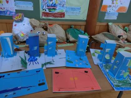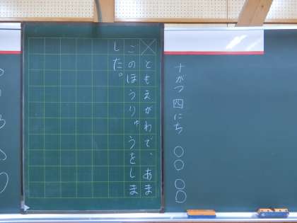 子どもたちが登校する前の校舎は静かです。1年生の子どもたちの机の上にはプラスチックのケースが置いてありました。登校したらすぐに朝の支度ができるように帰るときに準備をしたのでしょう。黒板には日記の書き方のお手本でしょうか、先生が書いた文字がありました。