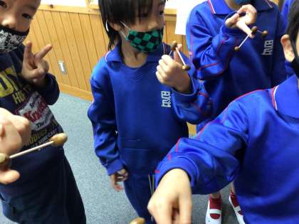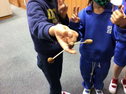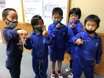 低学年教室に行くと、1年生の子たちが指先に何かをのせています。どんぐりで作ったやじろべえです。自然のものを使ったやじろべえですので、バランスをとるのが難しいと思いますが上手にできていました。「写真を撮りたいな、カメラを持ってくるね」と子どもたちに言うと、校長室までついてきてくれました。自慢のやじろべえと一緒に校長室でパチリ!よくできました!