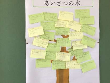 あいさつの木&おはなしの木 公開日 2022/11/04 更新日 2022/11/04 校長室から 2年生教室前の掲示板に2本の木が掲示してあります。あいさつの木と、おはなしの木です。本を読んだらその感想を書いて貼ります。あいさつをしたらそのことを書いて貼ります。ずいぶん葉っぱが繁ってきましたね。ちょうど放課で、子どもたちが先生のところで楽しそうに話をしていました。鬼太郎の絵を見せてくれた子がいました。上手だね!お礼に目玉おやじのモノマネをしてあげました。