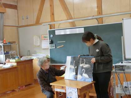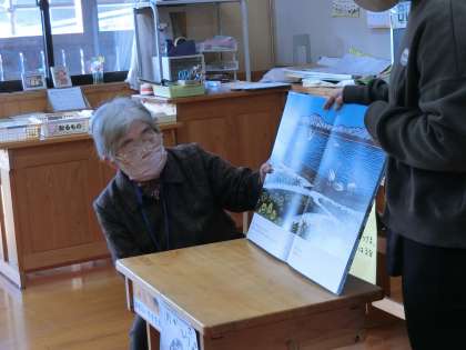 大型絵本を準備してくださいました。子どもたちは本に集中しています。