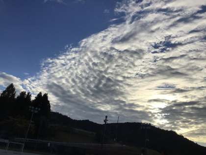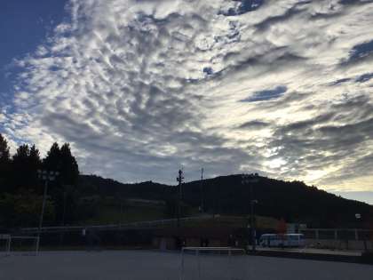 綺麗な雲が広がっています。南から北に向かってうろこ雲がのびていて、東の方向には入道雲のような形の雲が見えます。ホームページ用の写真はデジタルカメラかタブレットのどちらかで撮っていますが、タブレットで撮影した方が綺麗です(デジタルカメラの画素数を落としていることもあるのですが)。巴ケ丘の空は広々としていろいろな表情を見せてくれます。晩秋を思わせる素敵な空です。