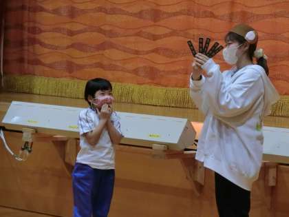 昼の時間を使って全校集会を行いました。年間を通じて様々な集会を行っています。子どもたちが順番に話すお話集会、図書集会、保健集会、体育の集会(全校体育・全校遊び)、そして今日の集会は先生たちが順番に登場する先生たちのお話を聞く集会です。それぞれの先生の人柄がにじみ出る楽しい集会です。今日登場するのは、教務主任、5年生&6年生の担任です。一人ずつ話をするのかと思ったら、今日は3人でマジックショーをしてくれるとのことで会場は大盛り上がり。
