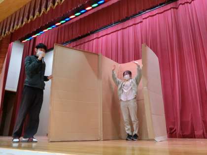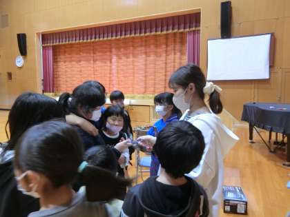 マジック三連発 公開日 2022/11/10 更新日 2022/11/10 学校行事 最後のマジックは大掛かりなマジックです。定番の「人が消えるマジック」。箱の中に入った人が消えたり現れたり。子どもたちは「箱の後ろに隠れて箱と一緒に回っている!」「カーテンの中に隠れている!」と言いましたが、残念ですね、どちらも違います! 全校で笑いました。みんなで笑うのはいいですね。企画してくれた先生たちに拍手です。集会が終わった後に、タネを知りたがった子どもたちが先生の所に集まってきました。