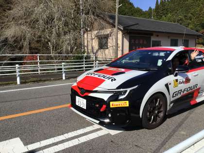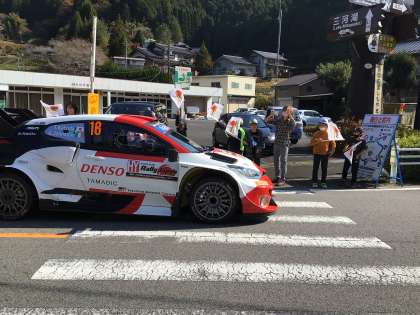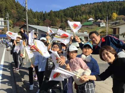 旗を振って応援です。通っていく一般の方の車にも旗を振ると、笑顔で通り過ぎていきます。ラリーの選手の皆さんも手を振ってくれました。