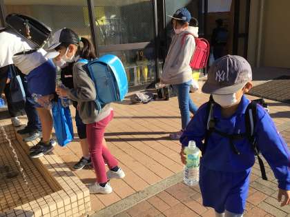 子どもたちが登校してきました。校舎に入る前に「花いっぱい活動」で植えたプランターに水やりをしています。玄関に準備されているペットボトルに水を汲んで自分のプランター(マイプランター)に水をあげます。