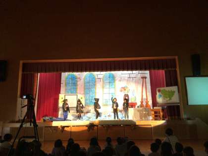 観客の様子からも劇や演技が良いことが伝わってきます。どの子も、この1、2週間で自信をもって演技できるようになってきました。下の写真は2年生の劇です。少しだけ。