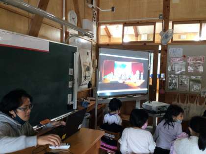 午前中の校内学芸会を終えて5時間目、いくつかの学年で演技の振り返りをしていました。午前中に録画した動画を担当の先生がすぐに共有フォルダに入れてくれて、各学級で先生のタブレットとICTカートをつないで子どもたちに見せています。写真は1年生教室の様子です。
