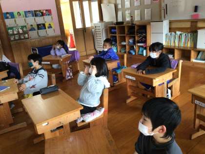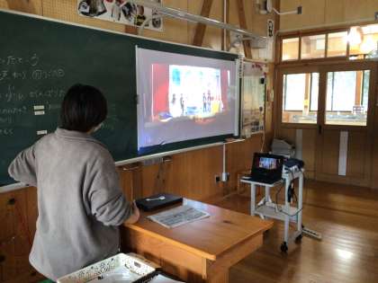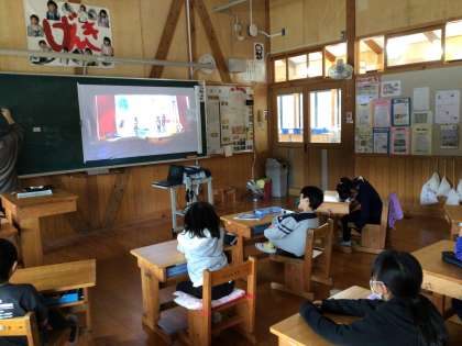 2年生教室でも校内学芸会の劇をタブレットを使ってスクリーンに投影し、子どもたちが見ていました。もっとがんばれるポイントを先生が黒板に書いていきます。2年生の子たちの演技はとても良くなってきましたよ。でも、みんなが「まだがんばれる」と思えば、きっとさらに良くなります。楽しみです!