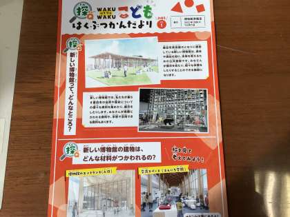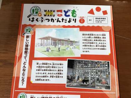 今日子どもたちに配付する「こども博物館だより」の写真です。現在、豊田市美術館の隣に建築中の博物館は、2024年秋に全面オープンの予定です。今の5年生の子たちが卒業する年にオープンするということで、2年前、今の5年生が3年生の時に学校でどんぐりを植え、苗木をポットで育ててきました。来年、6年生になった子どもたちが自分たちが育てたどんぐりの苗木を持って博物館へ植樹に行きます。