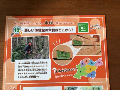 博物館に使われる木は下山で伐採されたものだそうです。巴ケ丘小学校にも下山の木がふんだんに使われています。故郷の山の木が自分たちの学校や豊田市の施設に使われていることは嬉しいことですね。