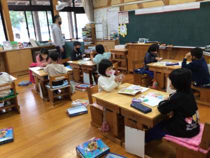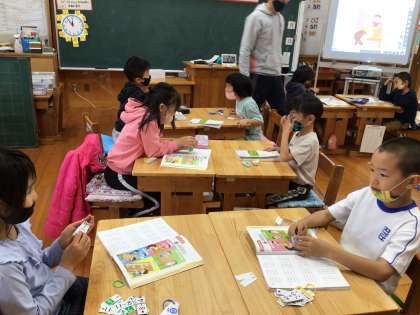 1年生の算数の授業です。2人一組になって引き算カードを使った勉強をしています。友だちと楽しく勉強ができるっていいですね。学校では、新型コロナウイルス感染症予防のためのガイドラインによって、こうした対面での活動、至近距離で組み合う体育の実技、室内で近距離で行う歌唱や器楽の活動などが制限されていた時期もありました。こうした活動は大事です。子どもたちの姿を見て改めて感じます。