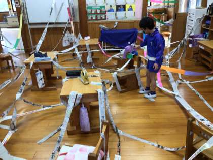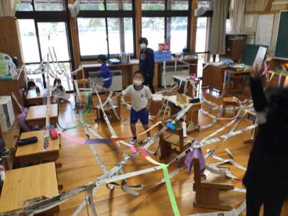 2年生の図工です。教室をのぞいてびっくり!入り口でびっくりして立ちすくんでいると、子どもが「こっからだったら入れるよ」と案内してくれました。「つないで つるして」という造形あそびの単元です。教室がすごいことになっています!