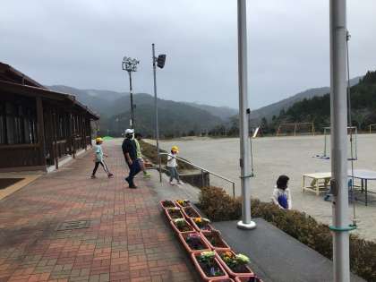 昼の放課です。さっきまで霧雨が降っていました。当然、昼は外で遊べないだろうと思っていましたが、子どもたちが口々に「降っていないじゃん!」と言いながら外に飛び出してきました。校長室からその様子を見て「いやいや、本当かな」と気になり、外に出て手をかざしてみました。確かに降ってはいませんがほんの少し細かい霧雨が降っているような微妙な感じ、遊べないこともない気がします。「降ってきたら中に入るんだよ」と声をかけました。風邪をひくのが心配です。