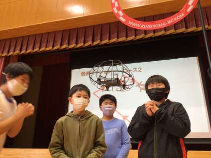 高学年の活動の様子です。今日の2、3時間目に講師の方に来ていただきプログラミングをしてドローンを飛ばす活動を行いました。子どもたちはタブレットを使って飛行距離や時間などのプログラムを組み、その通りにドローンが飛べるか実験しました。