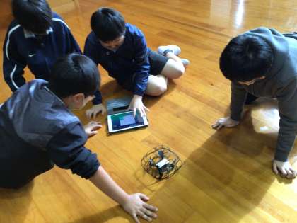 いくつかのグループに分かれて多目的室でドローンを飛ばしました。プログラム通りにうまく飛んでくれたときは歓声が上がりました。うまくいかなかったときはタブレットでプログラムを修正していました。