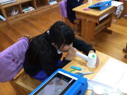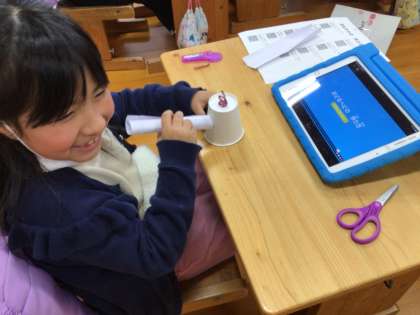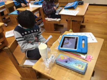 4時間目、2年生の生活科の授業の様子です。紙コップやモールなどを使っておもちゃ作りをしていました。紙コップの上に小さなモールを乗せて、筒状のもので息を吹きかけるとモールが面白い動きをします。今週の木曜日には地域の方にボランティアで来ていただいて昔遊びを教えていただきます。