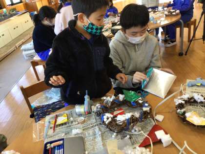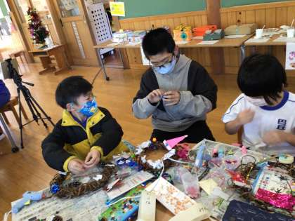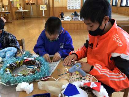6年生は「サンタクロースを付けてみる?」「ここに何を付ける?」と上手に1年生の気持ちを聞いています。全部やってあげるのではなく、1年生の子ができることはやらせながら気遣ってフォローする姿は、大人より上手じゃないかと感じるくらいです。1年生が「○○を付けたい」というと、タブレットで作り方を調べて折り紙で一緒に折っている姿もありました。その場で調べられるので便利ですね。