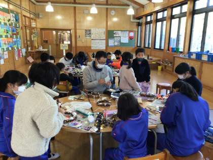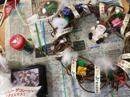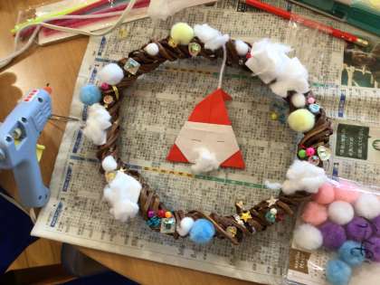 出来上がってきましたよ。子どもたちが作ったリースはおうちにぜひ飾ってくださいね。素敵なリースばかりです。