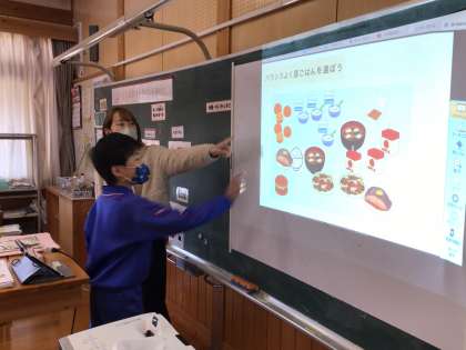子どもたちが選んだメニューについて、クラスで共有して話し合います。良いところ、付け加えた方が良いもの、タブレット画面が大きく映せてすぐに共有できるので便利です。