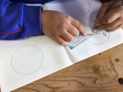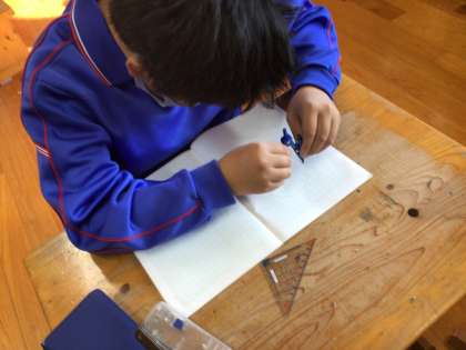 2日ほど前の、ともえ学級の算数の様子です。コンパスと定規を準備して、まず先生がコンパスの持ち方を丁寧に説明していました。子どもたちはノートにきれいな円をかいていました。落ち着いて取り組む姿に感心しました。