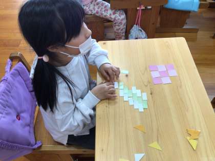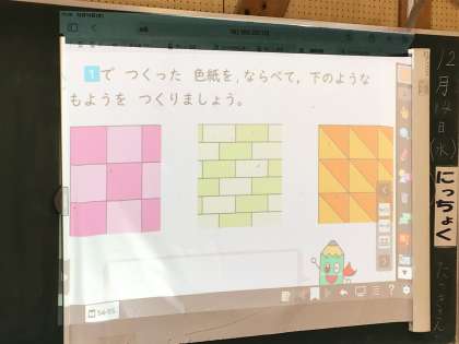2年生の授業の様子です。「三角形と四角形」の単元です。子どもたちは小さく切った色紙を組み合わせて模様を作る活動を行っていました。スクリーンに映された絵(デジタル教科書の画面を先生のタブレットから見せています)をじっと観察して、真剣な表情で模様を作る子どもたちです。
