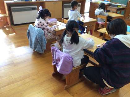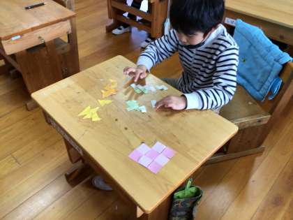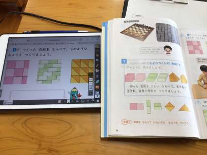 2年生の「三角形と四角形」の学習の様子です。オレンジ色の模様(三角形を組み合わせた模様)がけっこう難しいです。