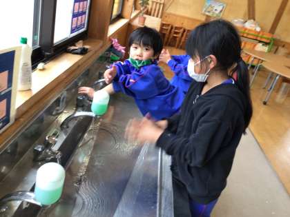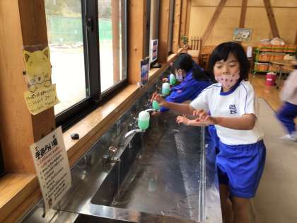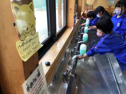 温水で快適 公開日 2022/12/15 更新日 2022/12/15 校長室から 「あったかい!」給食前の手洗いをしている1、2年生です。蛇口から出てくるのは温水です。2年前のコロナ対策特別予算を使って、本校では児童の手洗い場から温水が出るように工事をしました。石鹸を使ってじっくり手洗いをする子どもたちの様子をタブレットで撮った写真です。ずっと洗っていたくなるぐらい温かくて快適です。コロナに限らず手洗いは感染予防の基本です。 今日はパンです。きれいな手で美味しくいただきましょう。