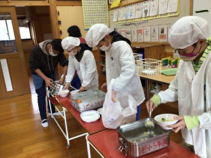 チームワーク 公開日 2022/12/15 更新日 2022/12/15 各学年から 5年生教室の様子です。チームワークよく配膳をして短時間で配膳が終わるように子どもたちは頑張っています。最近メキメキ配膳が上手になってきた子どもたちです。コツは段取りと協力。白衣を着て配膳台を出して、拭いて、食器をセッティングして盛り付けて配る。それらがスムーズにできると仕事が滞ることがありません。手際よく配膳してゆったり味わって食べましょう。