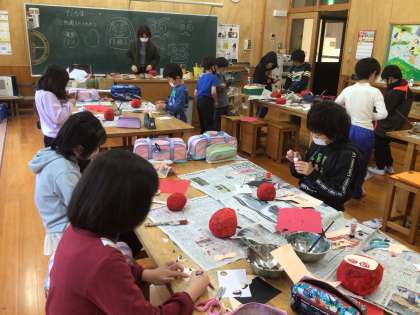 3年生の図工はだるま作りです。新聞紙を丸めて目鼻をつけて表情豊かなだるまを作っています。楽しいだるまがたくさんできそうです。