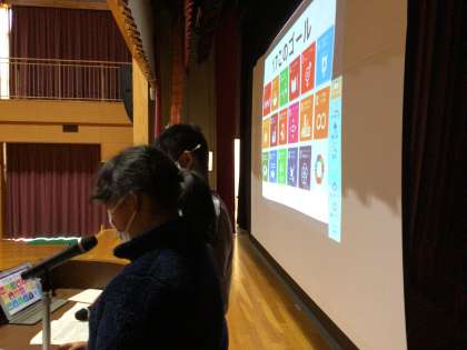 昼の時間を使って6年生が総合的な学習の発表を行いました。テーマはSDGsです。持続可能な社会の実現に向けて17の目標があり、その中でも特に、子どもたちは「環境問題」と「作る責任、使う責任」について学習を深めてきたと説明しました。