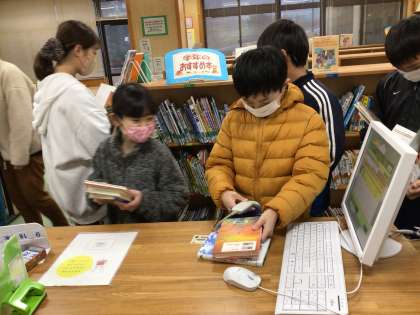 図書室のパソコンに繋がっているバーコードリーダーにバーコードをかざして貸し出しの手続きをしている子どもたちです。