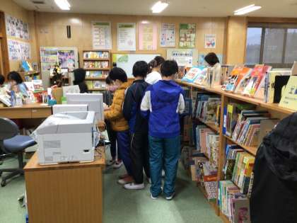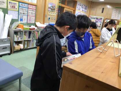 5年生と3年生は図書室で本を選んでいました。冬休みに読む本を3冊まで借りることができます。子どもたちは「どっちの本がいいと思う?」と迷いながら選んでいました。
