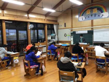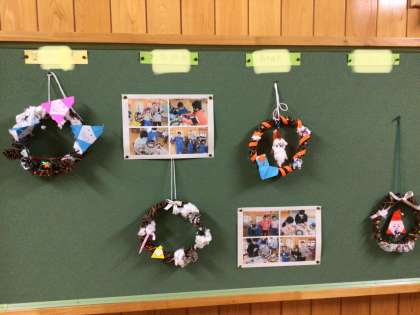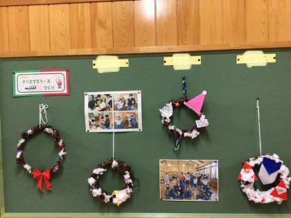 6年生教室です。今朝は読書をしていました。いつも落ち着いた雰囲気の6年生教室です。廊下の掲示板には先日作ったクリスマスリースが飾ってあります。持って帰りますので、お家にぜひ飾ってくださいね。