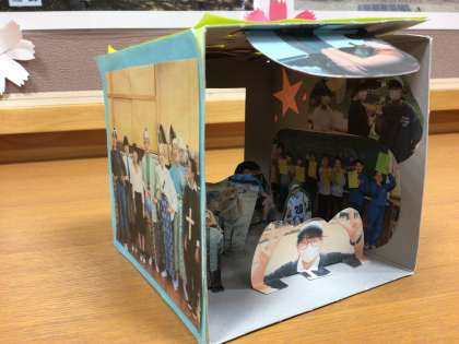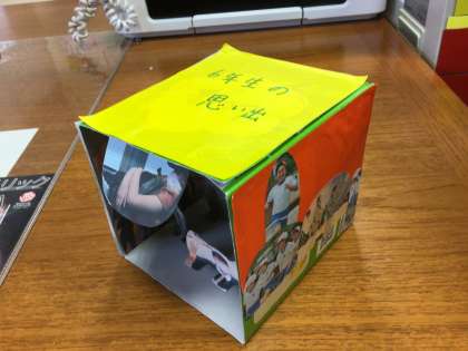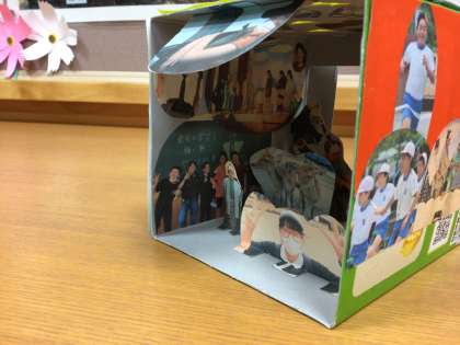 これは子どもたちの参考になるようにと先生が作った思い出BOXです。外にも中にも、上にも横にも下にもたくさんの写真が貼ってあります。