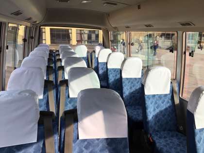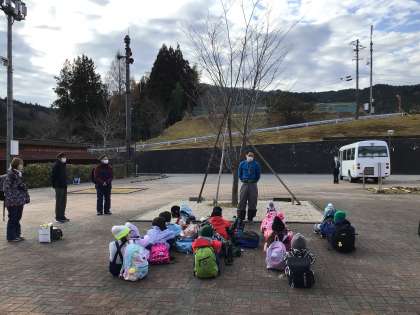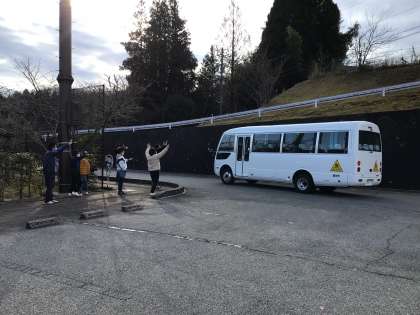 出発式で先生の話をしっかり聞いている子どもたちです。このあとバスに乗り込みました。バスの中はこんな感じです。窓を少し開けて換気をしていきます。どこかの学年が出かける時には、よく、他の学年がお見送りをしてくれます。3年生以上の子どもたちが見送る中、1、2年生が旭高原に出発していきました。