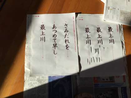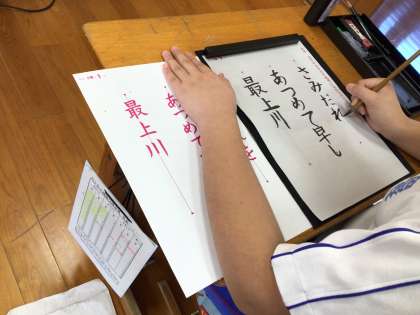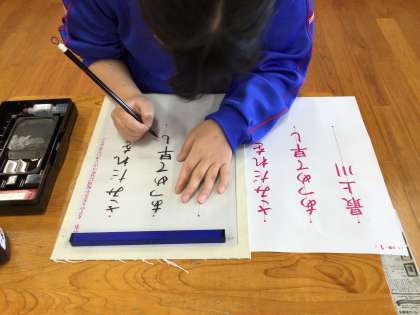 1時間目、6年生は書写の授業です。今日は細筆を使っていました。松尾芭蕉の有名な句「さみだれを あつめて早し 最上川」静かな時間が教室に流れています。