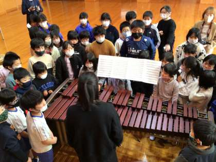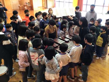 芸術に触れる 公開日 2023/01/19 更新日 2023/01/19 学校行事 楽器の仕組みもわかりやすく教えてくださいました。濱田さんが「楽器のそばにきてもらっていいですよ」と声をかけると、子どもたちはマリンバのところにわーっと集まってきました。このマリンバはグランドピアノと同じぐらいの値段です。滅多に近くで見ることはできません。大切に見せていただきましょう。舞台の上からタブレットでパチリ。先生たちも子どもたちも、みんな興味津々です。