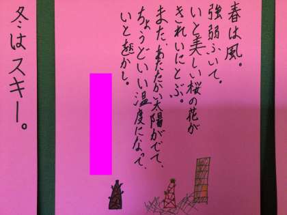 ●春は自然 桃色にそまった桜の木はとても美しい また キノコや竹の子が生えてきて 家族みんなで食べるたけのこご飯やキノコご飯を食べるのがとても好き