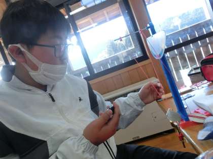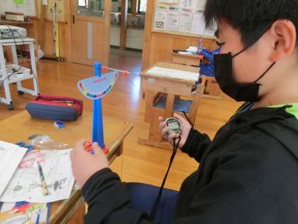 5年生の理科の様子です。5年生理科は教務主任が担当しています。振り子を使った実験で、重りの重量、糸の長さ、振り子が動き始める高さの条件を変えて実験をしています。ストップウォッチで時間を計測して、実験結果をワークシートに記録していきます。しっかりと考察につなげてくださいね。
