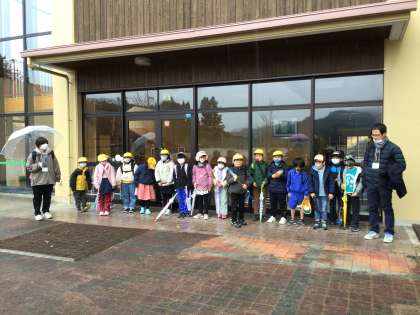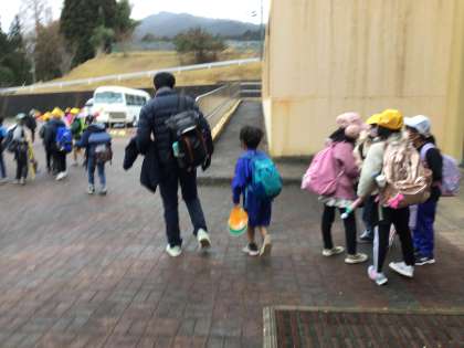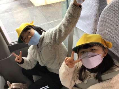 バスに乗ってジブリパークに出発です。雪が少し舞っていますが、風がないのでそれほど寒くは感じません。みんな傘を持って、校外学習問診票で体調を確認し、トイレを済ませてバスに乗り込みます。