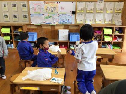 1年生教室の様子です。黒板には新入生へのメッセージが。手作りのおもちゃで一緒に遊びます。新入生の子たちはニコニコです。1年生はちょっと戸惑いながらも親切なお兄さん、お姉さんぶりを発揮!
