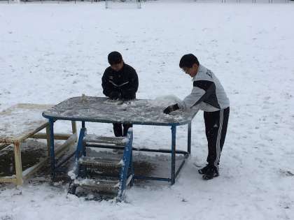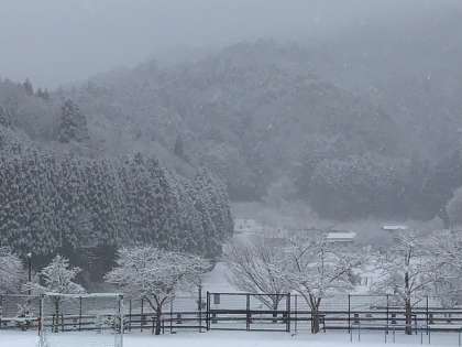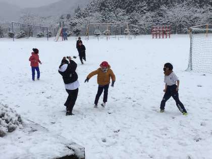 学校周りの山々も白く霞んでいます。墨絵のような景色になってきました。飽きずにまた外に出てきた5年生。雪玉を手に元気に雪合戦を始めました。なんと半袖の子もいます。指令台のところの二人組は雪で「大根おろしを作っている」のだそうです。思い思いに仲良く遊んでいます。