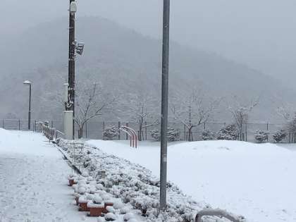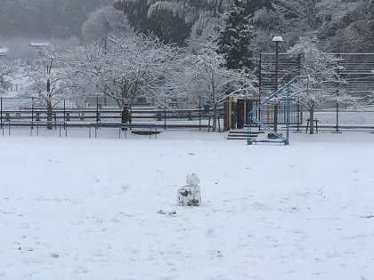 雪はどんどん積もります。手を真っ赤にして雪だるまを作っている子もいます。運動場の真ん中には昼頃作った雪だるまがいます。雪景色を撮るためにタブレットを持って外に出ました。気温はマイナス1度ぐらいです。それほど低くないのにこれだけ雪が降るんですね、びっくりです。