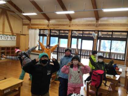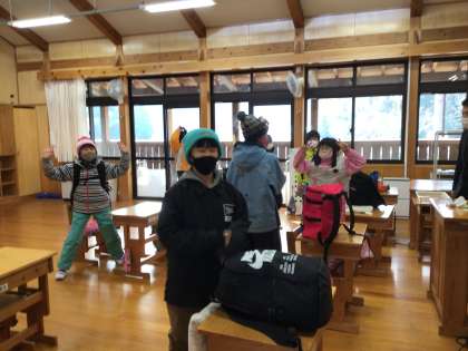 おはようございます。今日は3年生以上の子どもたちがスキーに行きます。みんな、やる気満々です。いってきます!