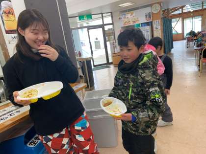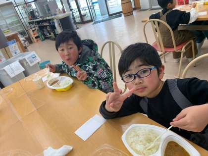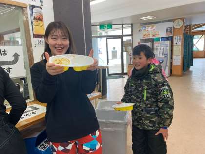 スキーといえばカレー。おかわりが自由です。なんて素敵でしょう!モリモリ食べています。先生もめちゃくちゃ嬉しそうにおかわりの列に並んでいます。